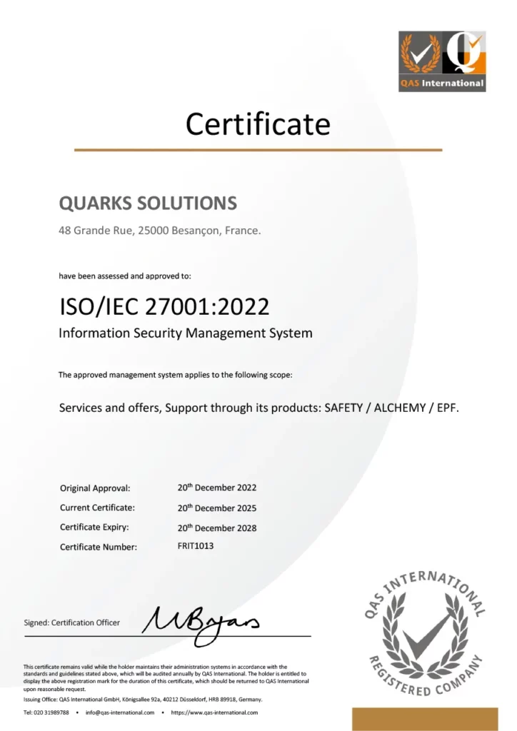 Quarks has been awarded ISO 27001 certification, an international benchmark that sets standards for the development, evolution and maintenance of an information security management system (ISMS). This recognition confirms our determination to apply best practices to ensure data confidentiality and protection.